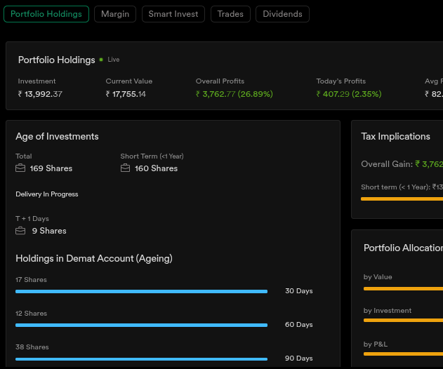 We do have the “Age of Investments” feature. Simply click on the Holdings icon in your portfolio, and you’ll be able to see the quantity over a 30-day timeframe. This feature is also available on the Dhan App under Age & Tax.