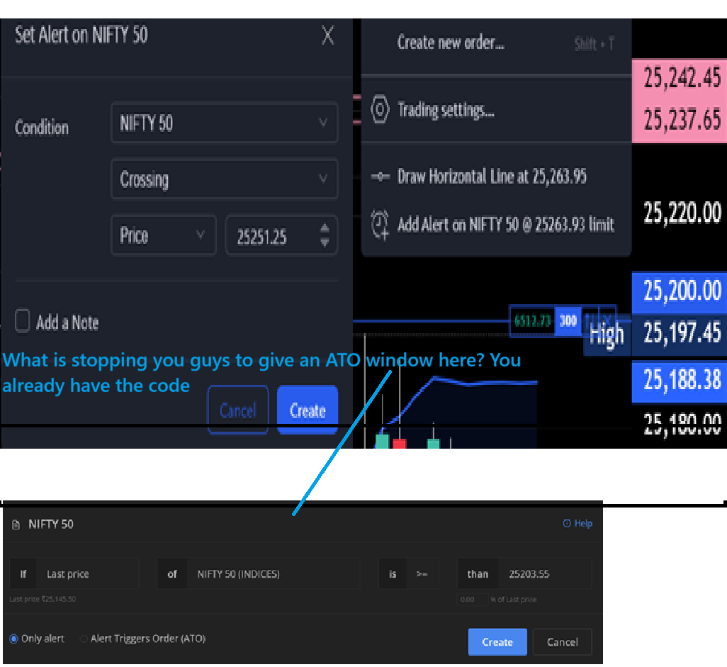 @Hardik I know you guys mut be working on some elegant solution for this, till that arrive in its full glory, can you pls add a ATO (Alert Trigger Order) window on the chart pls.