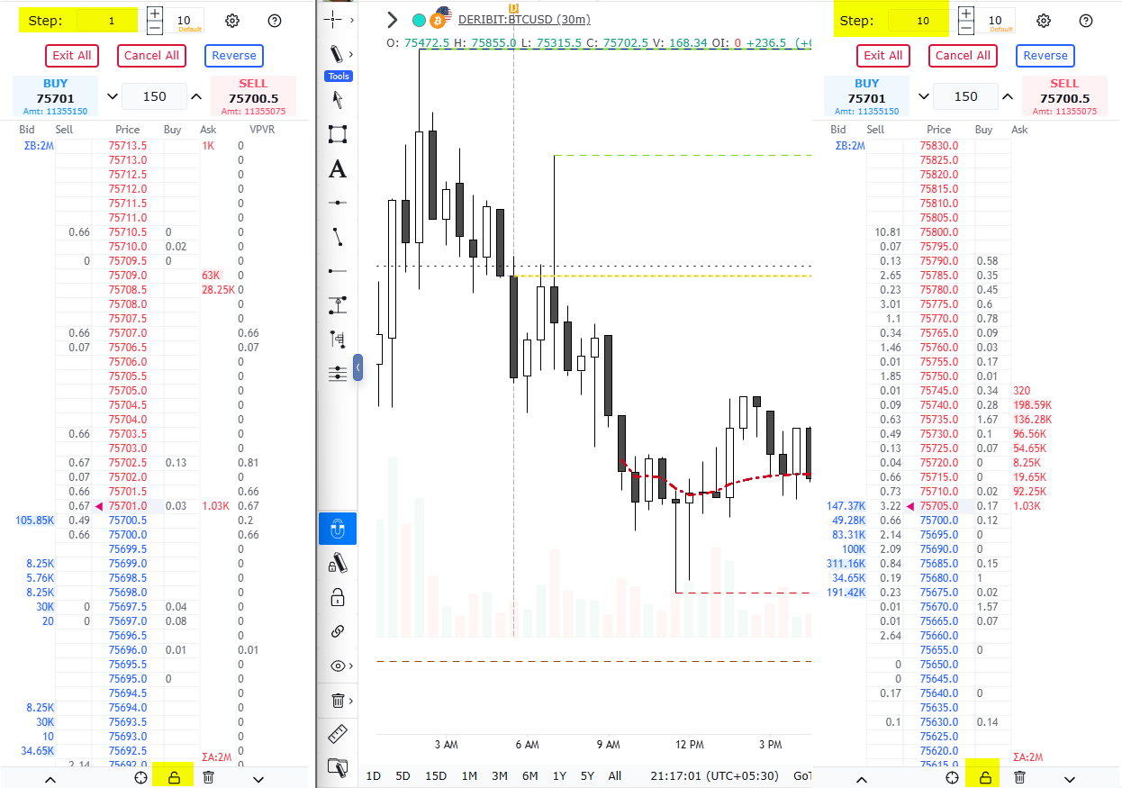 Tick Grouping / Step Adjustment: Currently, the ladder is fixed at tick-by-tick. For high-priced Nifty options or volatile stocks, we need the ability to group ticks/points (e.g., 5-tick/ or 10-tick steps) to see the order flow more clearly, similar to GoCharting. A setting by which bid / ask price increment / difference can be set would be very useful. I am attaching Go-chartings DOM image for your reference.