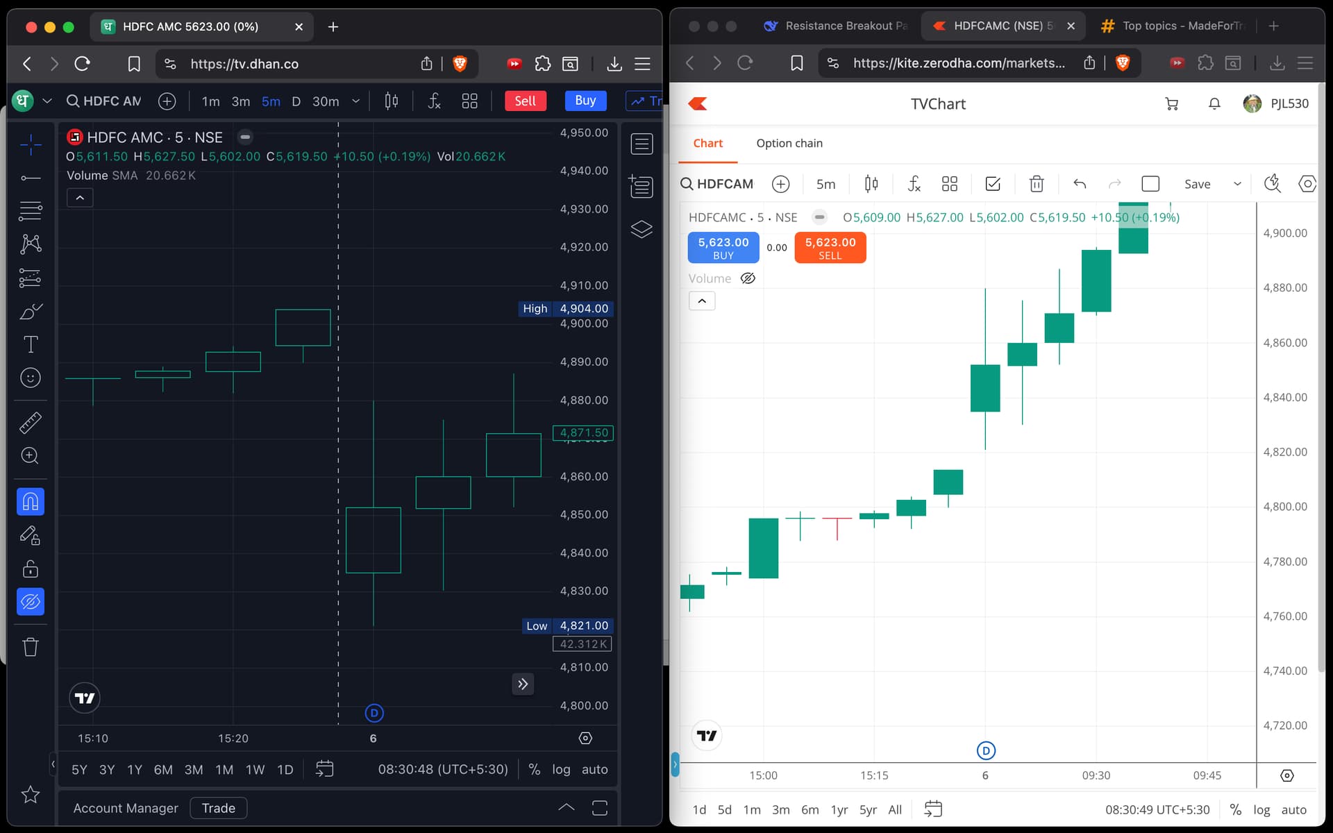 I have attached two screenshots of HDFCAMC on 2025-06-06. Dhan (Dark theme) shows it was a gap down while Zerodha (light theme) shows it was a gap up! I am backtesting on the data, and I am very confused which API to go with. which is correct?