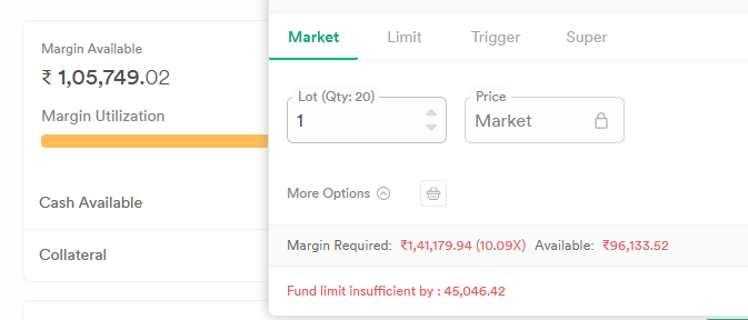 page refresh kar k dekha he bhai still same dikhata he even now it’s above 1lac only but on order window it’s less than 1 lac. available. kaafi baar hota he esa. kabhi esa bhi hua he k dikhata he available 1lac and jab 95k ka order place karo to error deta he k 4-5k kam he margin samaj hi nahi aata actual kitna he and on expiry day i use almost max margin available so mainly expiry days par hi ye issue dekha he.