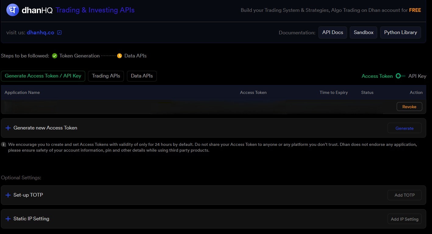 HI, recently I noticed some changes in dhan api acess window. Now what is the difference between api access token, api key its looking both are different. Most in dhanhq documentation is by using dhan access token, is dhan api key is for developers and sand box or any some other particular usage. Next one more thing is by default dhan changed access token time to 24 hrs, is it temporary (if so mention when we get chance to switch like long time period access token)or permeant. I also observed setup TOTP, if i login to dhan portal by default it request for TOTP to authenticate login its ok. but for algo generally we use access token, client id to trade, then how algo users need to authenticate this TOTP by web or app or any documentation updates coming. Next How many static IP are allowed, can we change when ever needed or any restrictions their for static ip.
