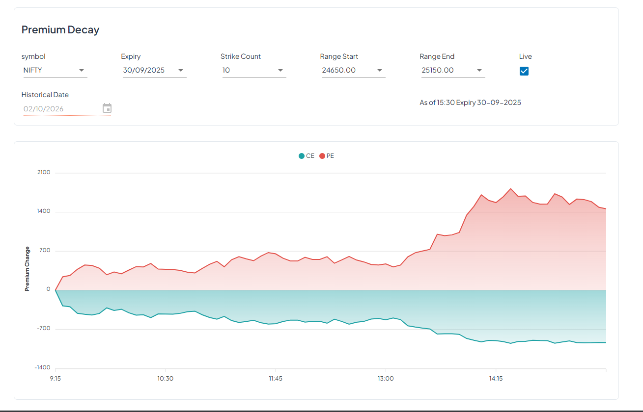 Feature Name: Premium Decay vs. Price Chart Description: A real-time chart that overlays the Option Premium price with the Time Decay (Premium Decay) over the course of the trading day or week.
