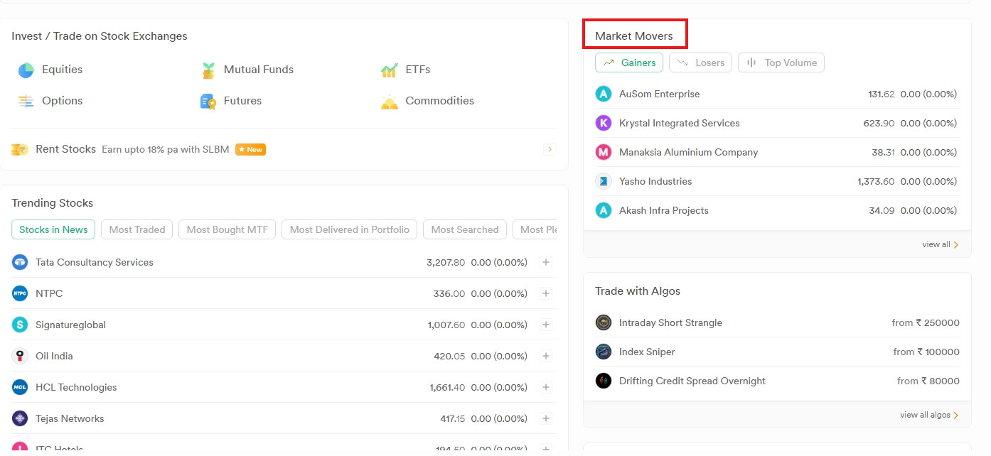 In the above image, market movers has three sub heads: Gainers, Losers and Top volume.