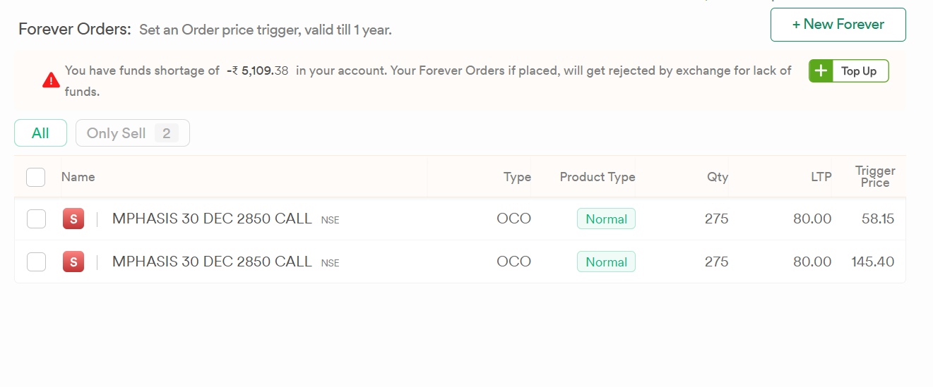 “You have funds shortage of ~₹5,109 in your account. Your Forever Orders, if placed, will get rejected by exchange for lack of funds.”