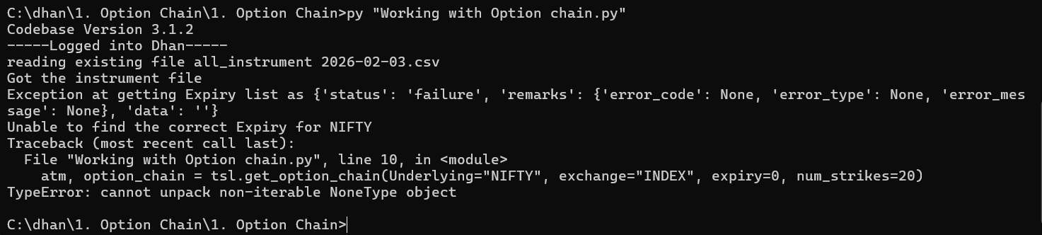 Iam getting below error while running Option chain code, Need your support and suggetion to fix it.
