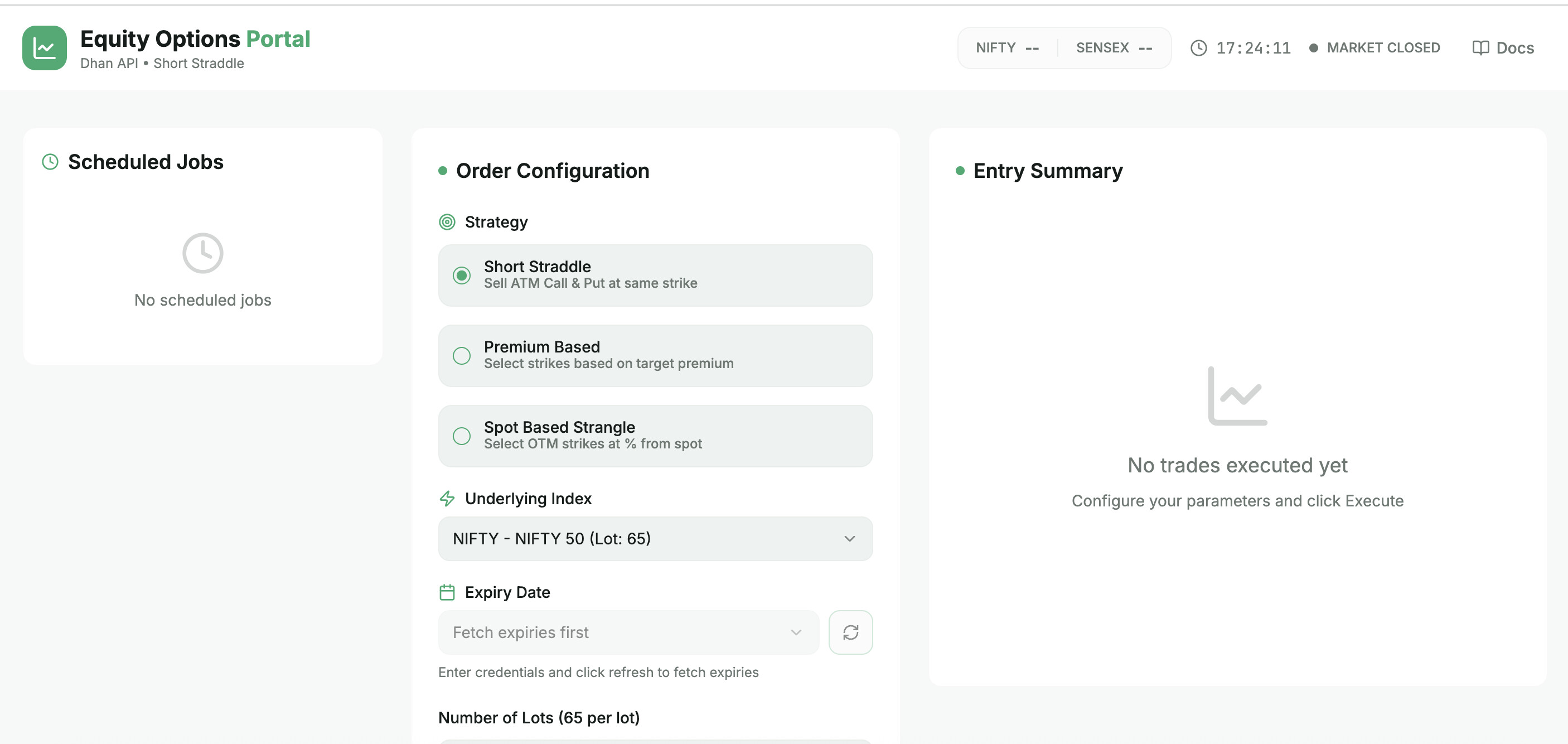 Live Market Data — Real-time Nifty and Sensex spot prices, automatic expiry date fetching, and an entry summary showing exact strikes, quantities, premiums, and stop loss trigger levels before execution.