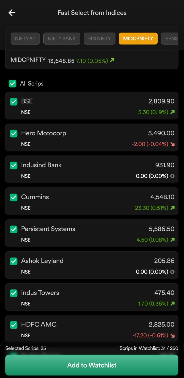 In the Watchlist menu, under the Buildup category, please add Sensex and Midcap Select as well. Currently, only Nifty and Bank Nifty are visible.