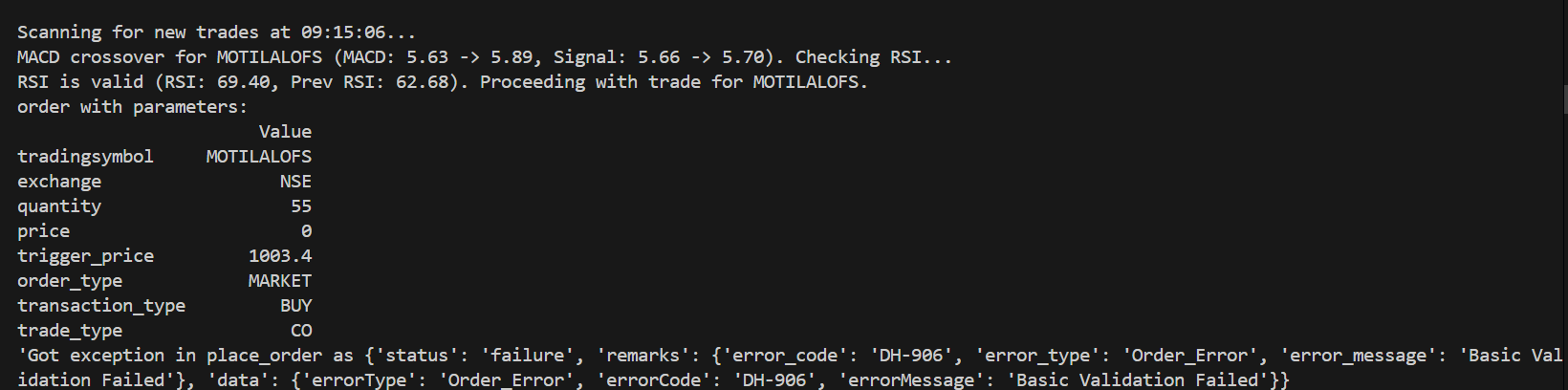 'Got exception in place_order as {‘status’: ‘failure’, ‘remarks’: {‘error_code’: ‘DH-906’, ‘error_type’: ‘Order_Error’, ‘error_message’: ‘Basic Validation Failed’}, ‘data’: {‘errorType’: ‘Order_Error’, ‘errorCode’: ‘DH-906’, ‘errorMessage’: ‘Basic Validation Failed’}}
