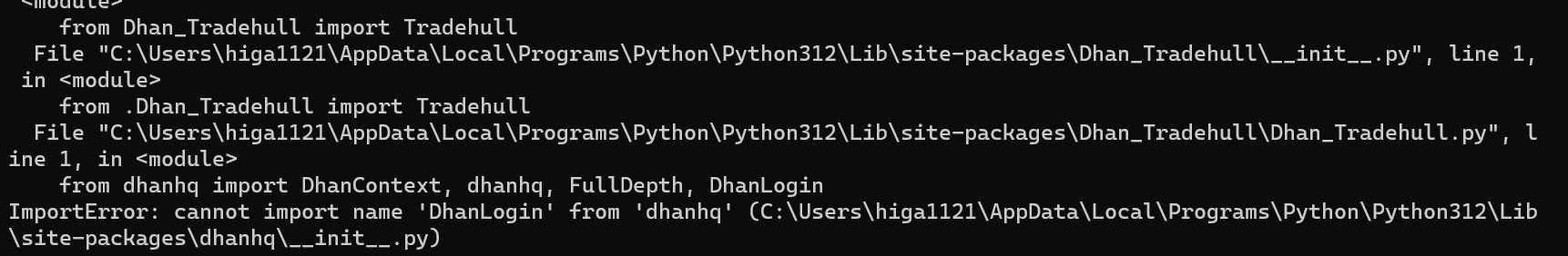 ImportError: cannot import name ‘DhanLogin’ from ‘dhanhq’ (C:\Users\DK\AppData\Local\Programs\Python\Python312\Lib\site-packages\dhanhq_init_.py)