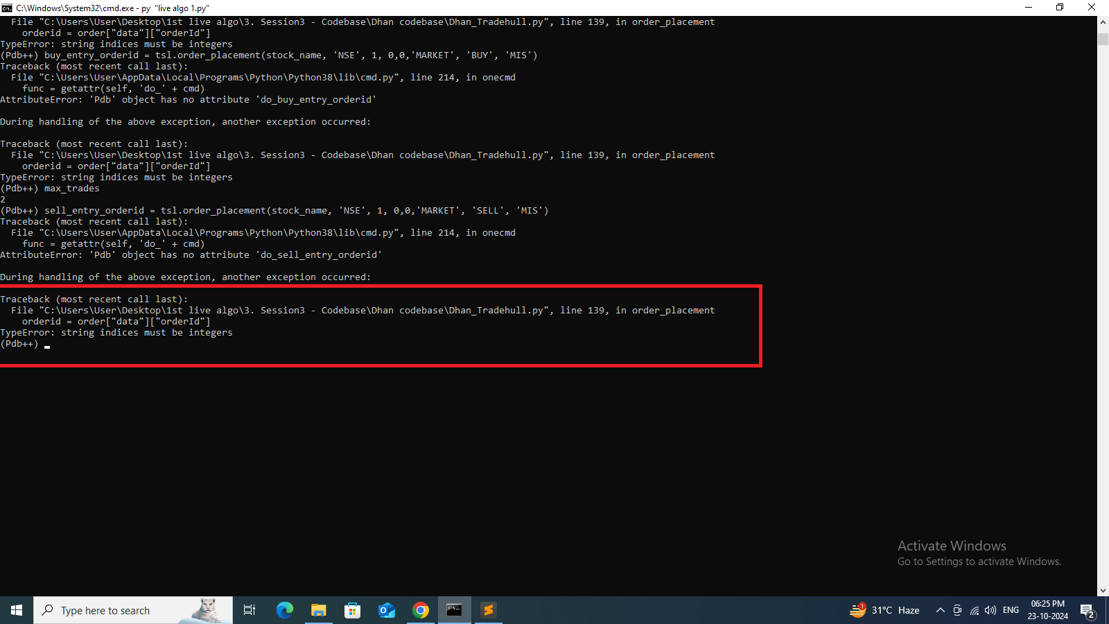 (Pdb++) buy_entry_orderid = tsl.order_placement(stock_name,‘NSE’, 1, 0, 0, ‘MARKET’, ‘BUY’, ‘MIS’)
