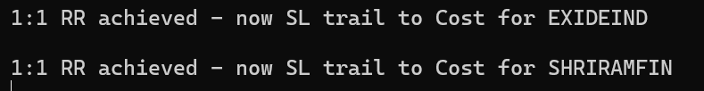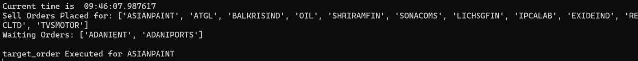 print(f"Target reached. Selling {trading_symbol} at market price. Sell Order ID: {sell_entry_orderid}")