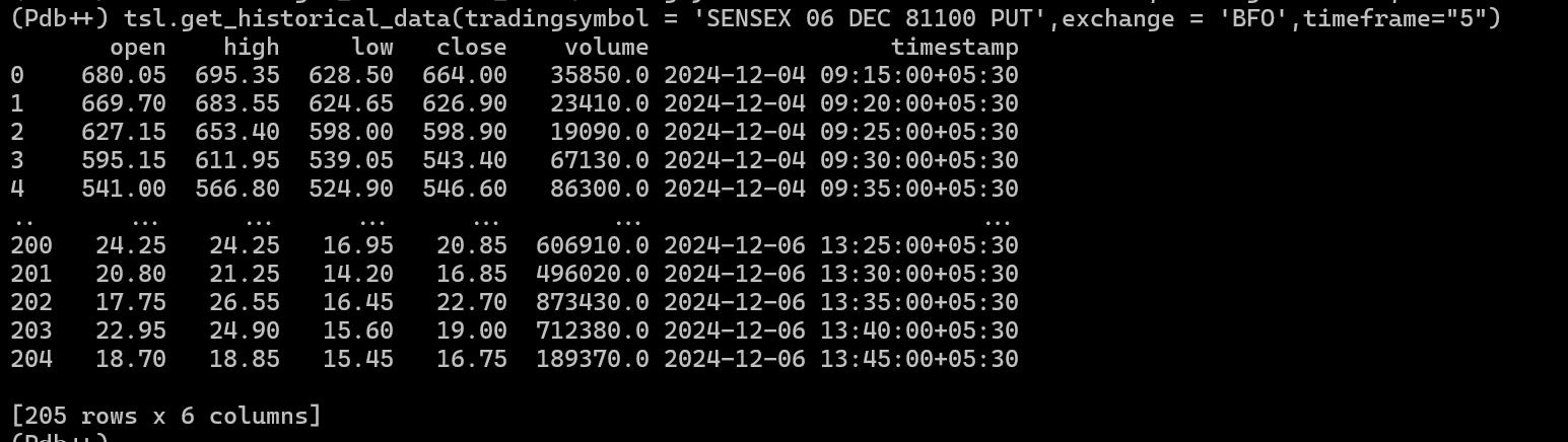 daily_data = tsl.get_historical_data(tradingsymbol = name, exchange = 'NSE',timeframe="5")