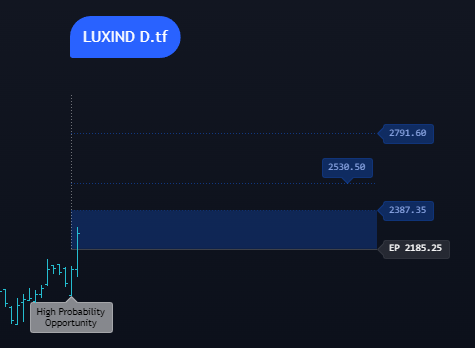 The signal was generated on 2-8-2024 and set-up said itâs a âHigh Probability Opportunityâ. Normally, I should have taken the trade. However, as all-around LuxInd, stocks were in red, I thought I would be trapped, so I âsecond-guessedâ the system and ignored the signal to take position at 2185.25. The stock hit 10% and has closed strongly and I am red-faced. So an opportunity was missed because of you know what!