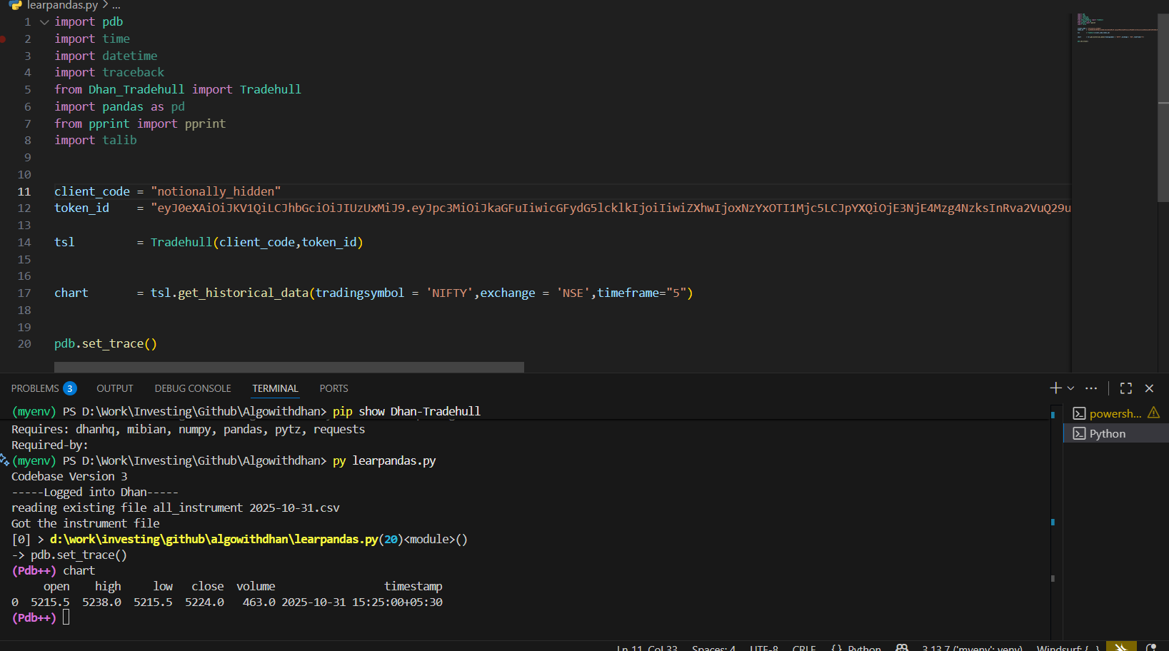 Respected @Tradehull_Imran sir I am trying to fetch NIFTY data form the session1 of Advance algo with dhan series but the code is not working.