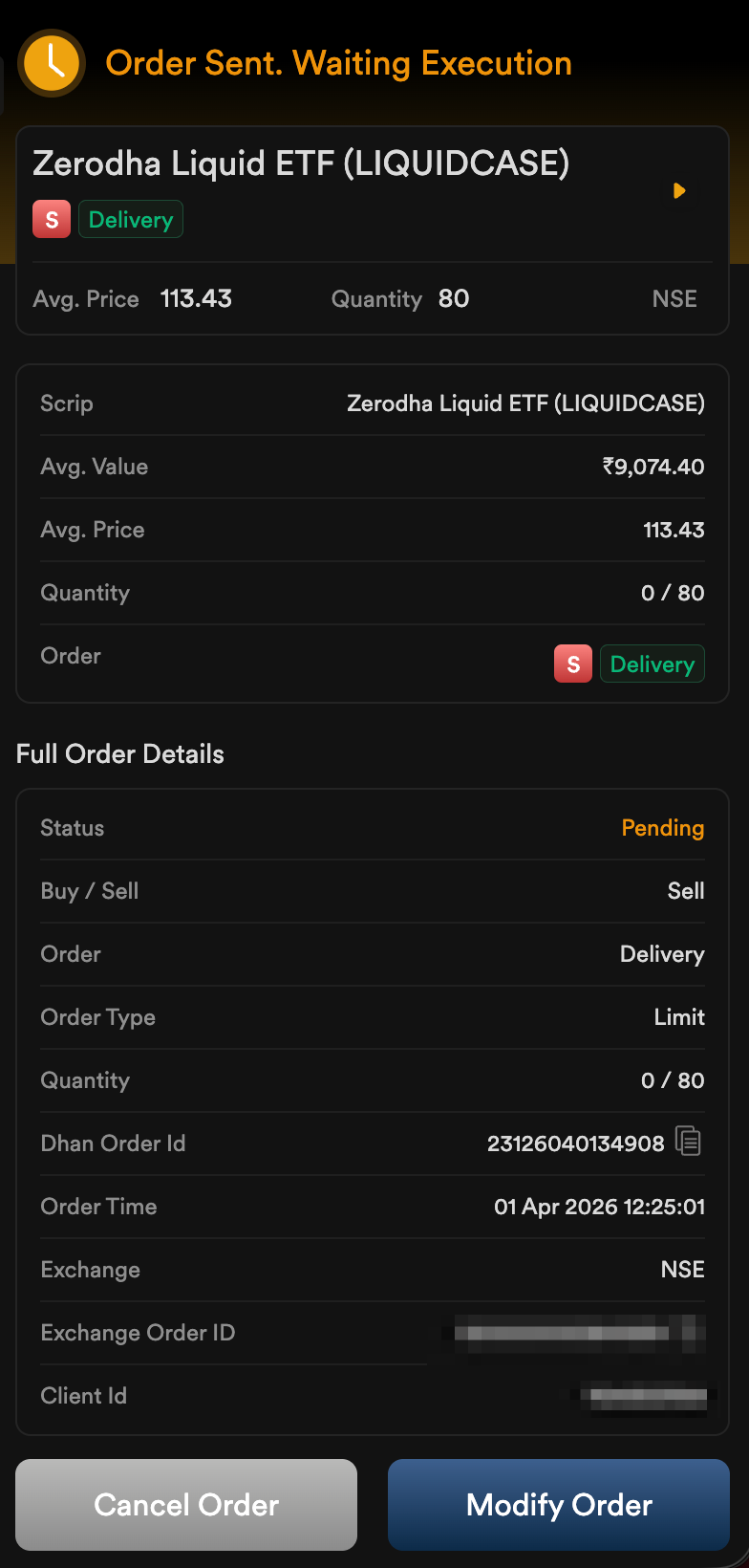 Now let me take my own example of todayâs orderId: 23126040134908. The MARKET order was placed at 12:25:01pm today to sell the 80 qty of LIQUIDCASE, your DHAN system has set the LIMIT price of 113.43 (best bid & ask price or whatever the logic you have now) and itâs been more than two hours the LTP of this ETF is hovering around the same price 113.43, but due to LIMIT order condition the execution is queued with exchange, it will be probably CANCELLED if I do not manually convert to MARKET.