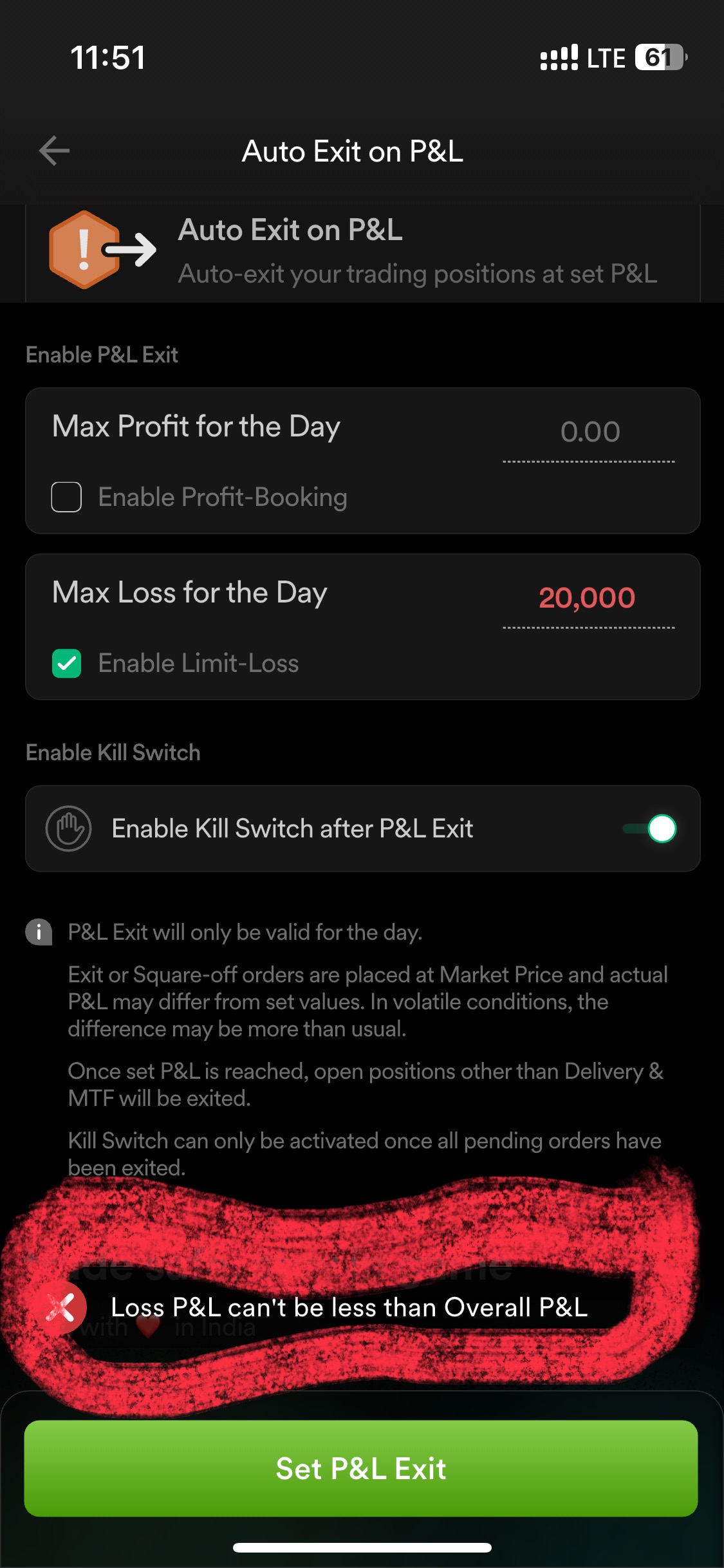 Hi @NAYAK, this error indicates that while setting P&L values, your overall profit or running PnL must be higher than the loss amount you’re trying to set. This is part of the logical flow. For example, if your current P&L is already running at a loss of ₹5,000, you won’t be able to set a P&L exit at a loss of ₹3,000.