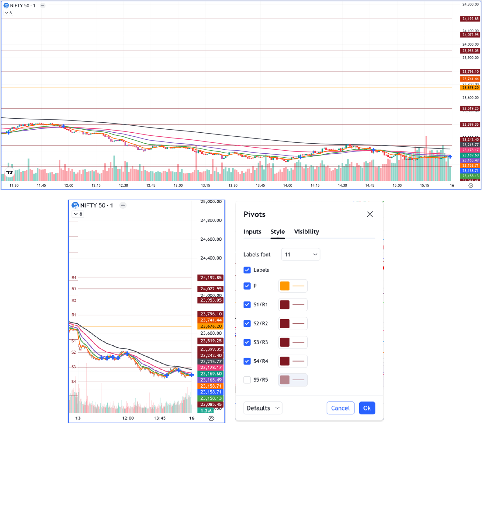 Current design of clubbing them into one makes it mandatory to display both Support & Resistance at that level on the chart. This wastes a lot of real estate on the screen space by squeezing the graph in a narrow band, especially when the Price is navigating between two deep Support or Resistance Levels, in which case, it would be very convenient to select just S3 & S4 or R4 & R5 for example and exclude everything else.