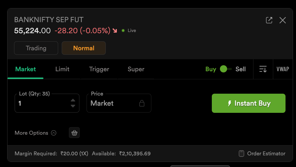 Hey @hachiko, since you’ve got an open short sell position in BANKNIFTY SEP FUT, the order window is considering it as an square-off position. That’s why the margin is just ₹20 i.e for (brokerage).