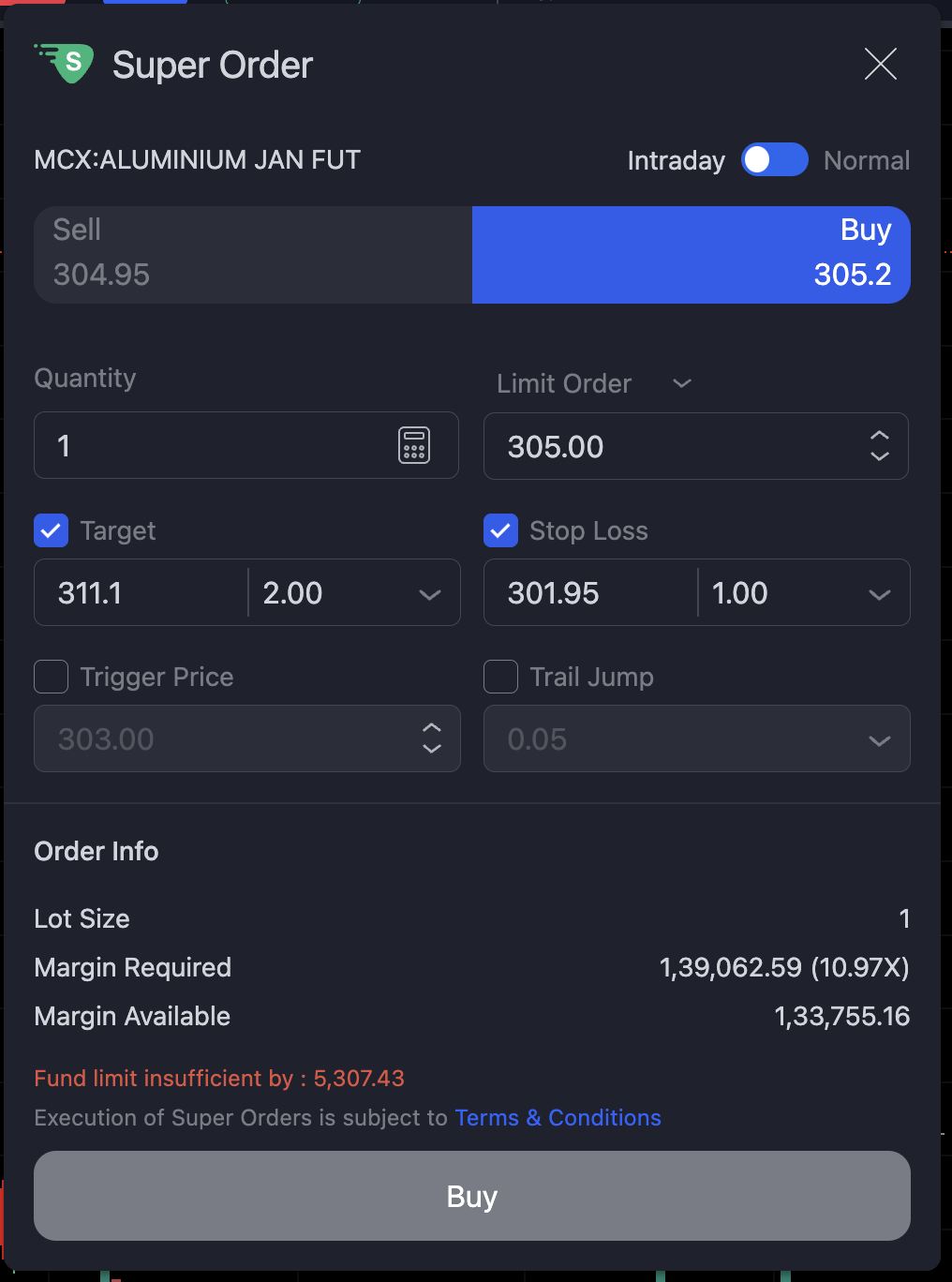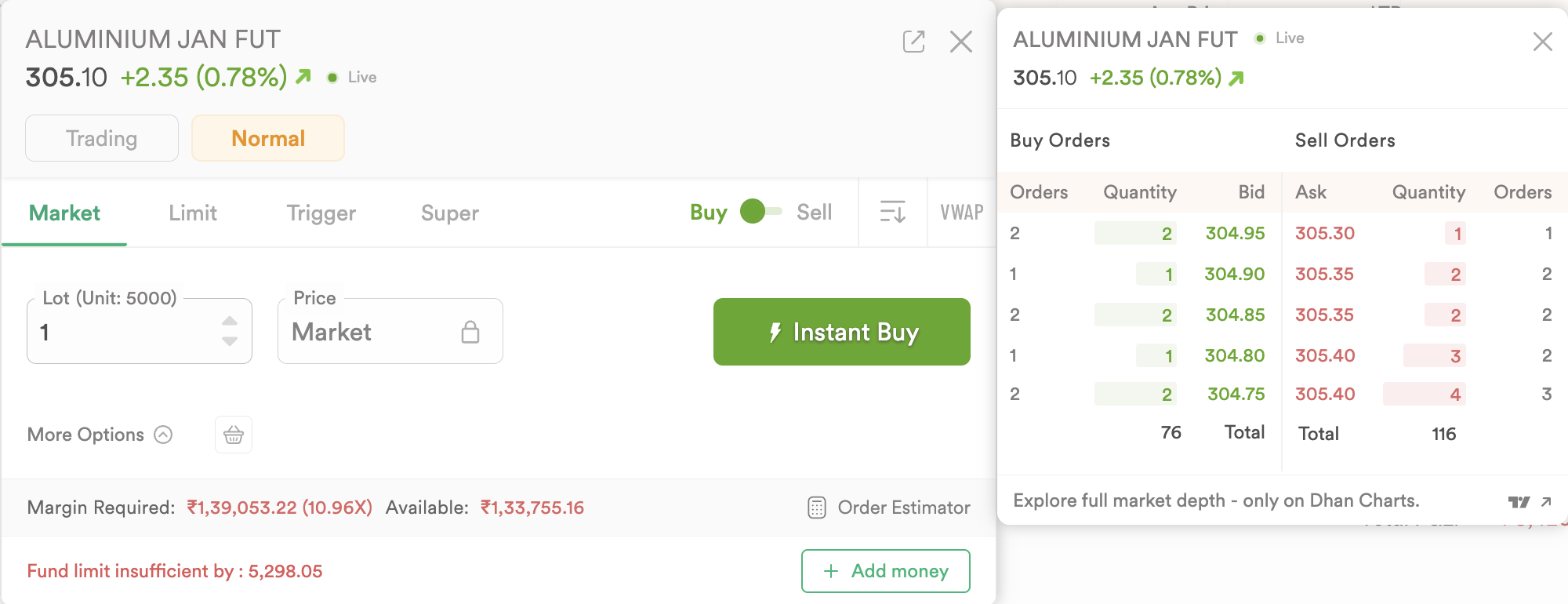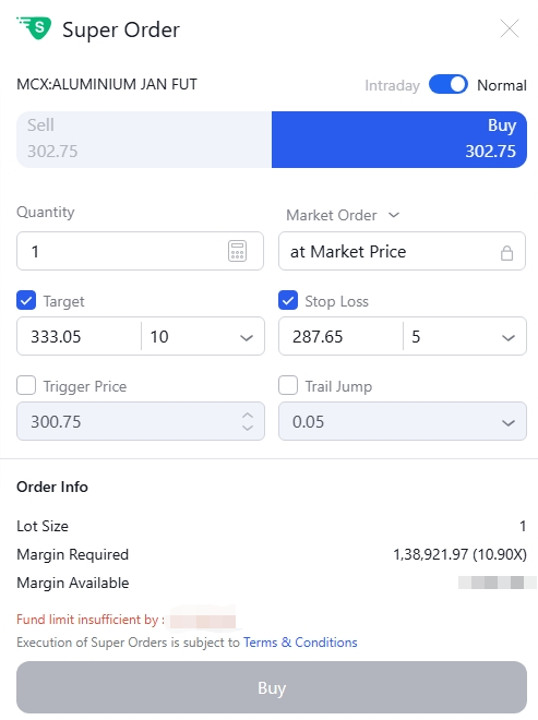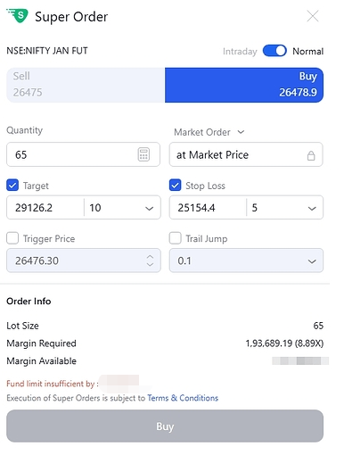 Thus, it gets difficult to trade without knowing lot size. And thus, I wanted that super order window should have that information. By the way, that information is present in Dhan native order window. Refer the two screenshots placed below: