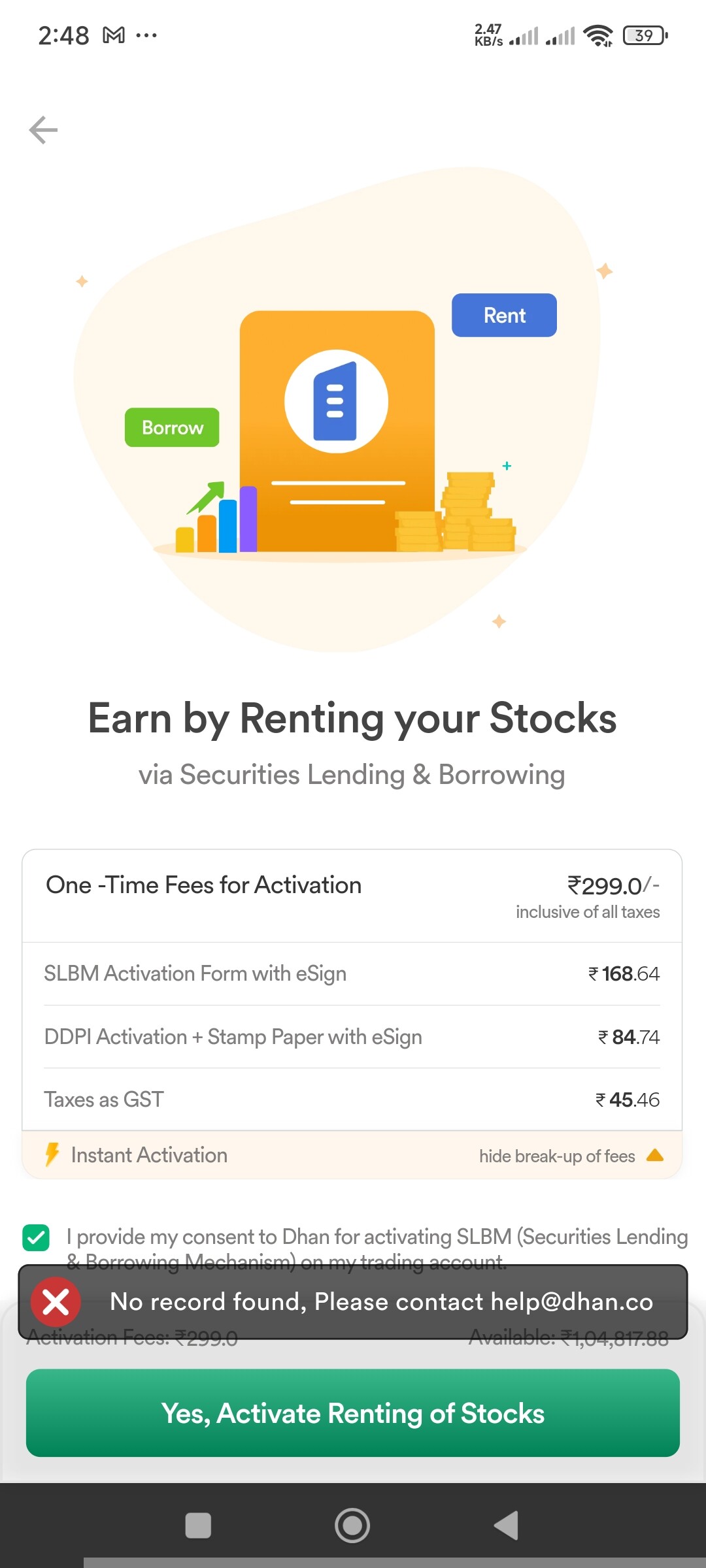 Hi @krishag, we request you to please complete your DDPI first and then try to activate the SLB facility, you can email us at onboarding@dhan.co and our team will guide you the process.