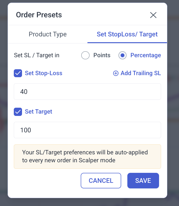 Currently, the Target & stop loss option allows only predefined percentage selections (e.g., +0.5%, +1%, +2.5%), It would be very helpful if users could manually enter custom values (both percentage and absolute price) for:
