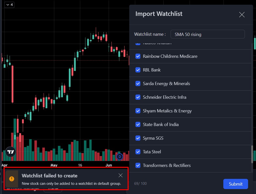 I am unable to import a watchlist to a group other than the default one. This functionality was working fine previously, and I have been using it regularly for several weeks without issues.