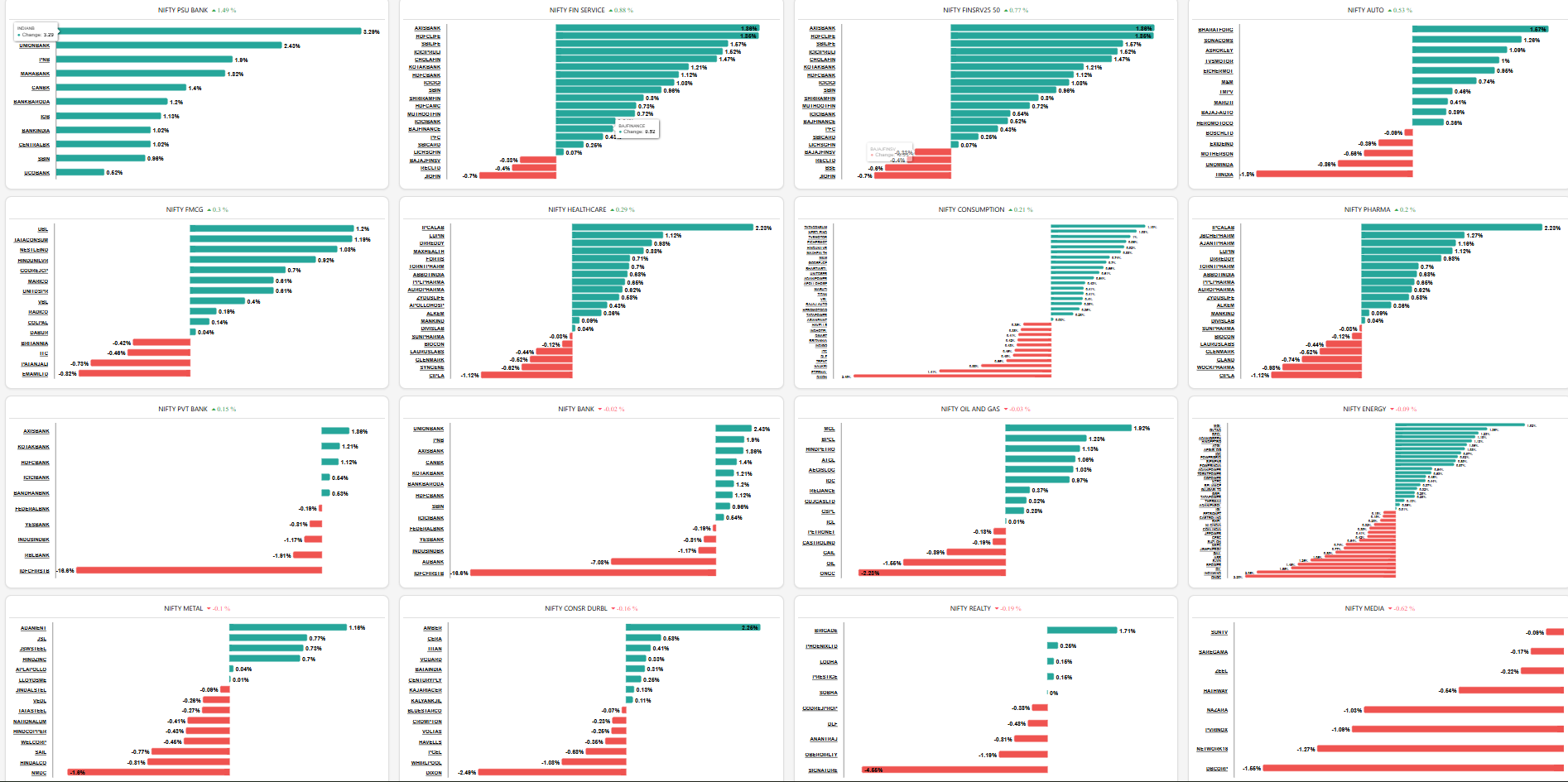 Grid Layout View: A single dashboard displaying mini-charts/bars for all key sectors (PSU Bank, IT, Pharma, Auto, etc.) concurrently.