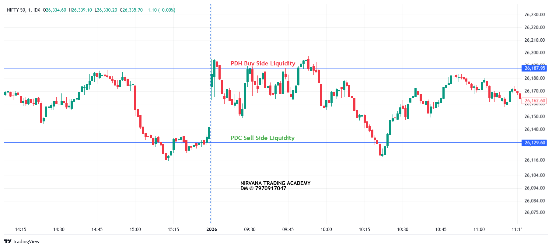 On 1st Jan’26, Buy orders were available above the PDH but the orders wasn’t sufficient for the Institutions to punch their big quantities. They showed some artificial bullishness and invited new buyers along with triggering old sellers Stop-Losses placed above PDH and induced the retails to buy and then Institutions started slowly punching their sell orders.