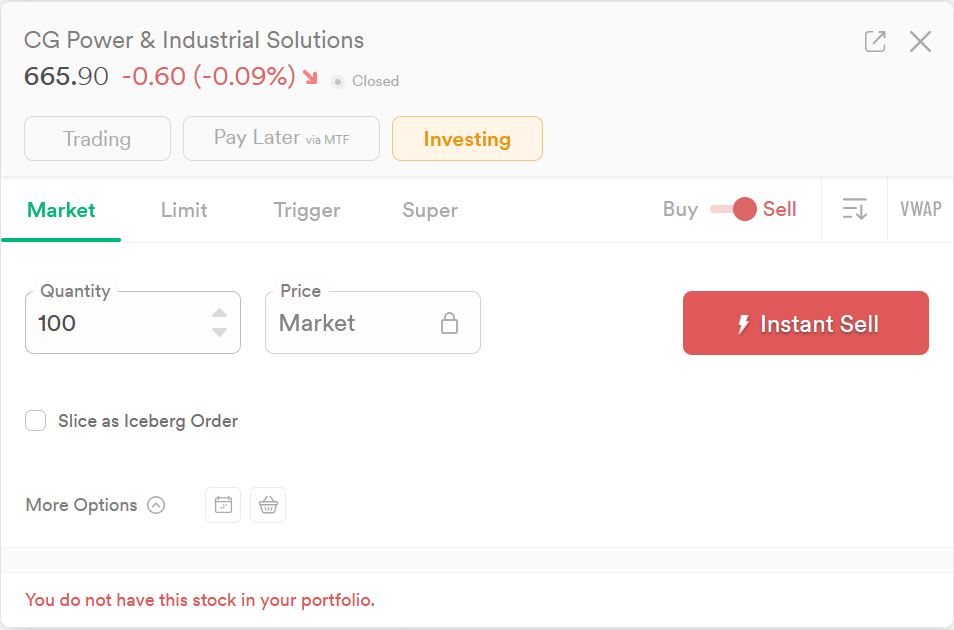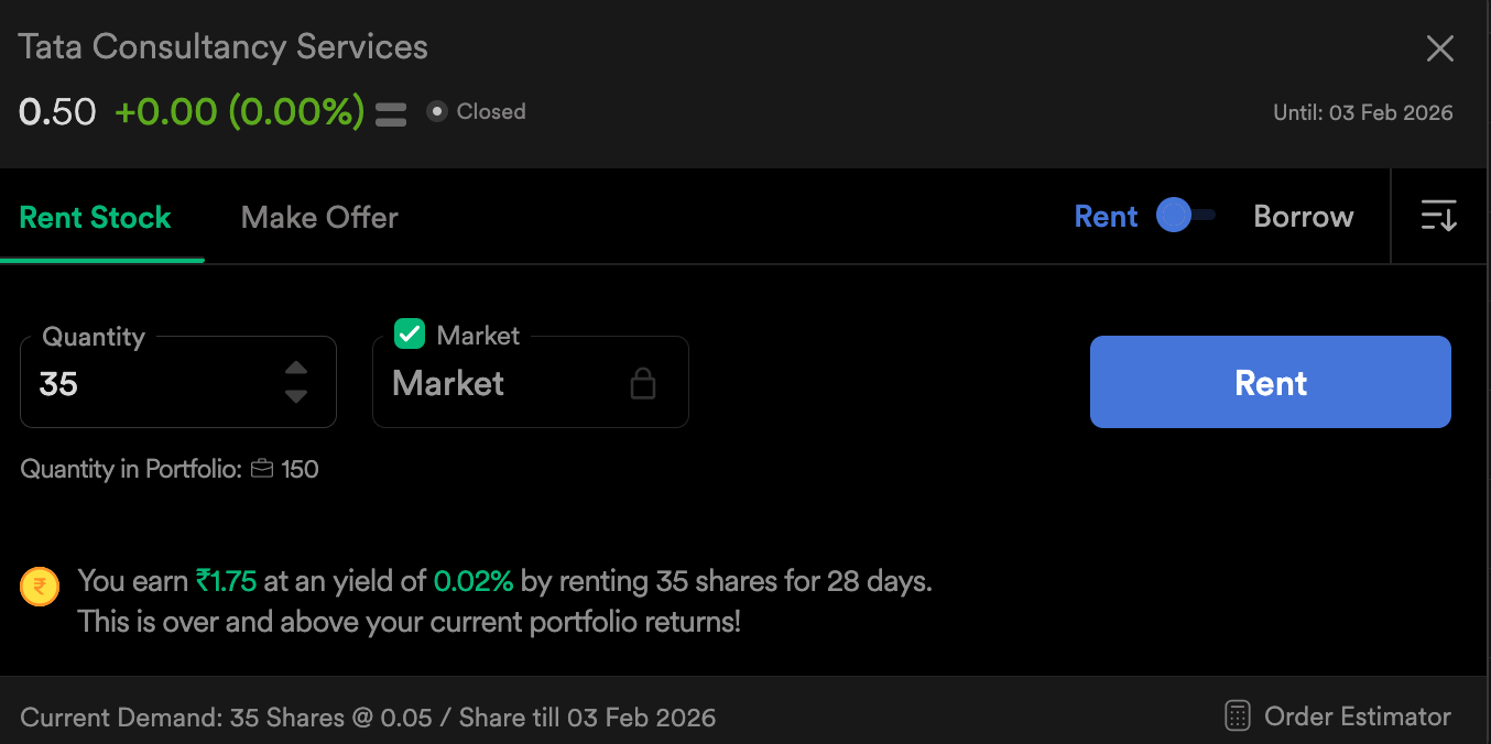 Let’s say an emergency occurs today at 11 AM. You can go to the Stocks on Rent section and place a recall order at market price. Your shares will be credited back to your demat account by tomorrow end of day. You can then place a sell order on Monday when the market opens and withdraw the funds on Tuesday morning.