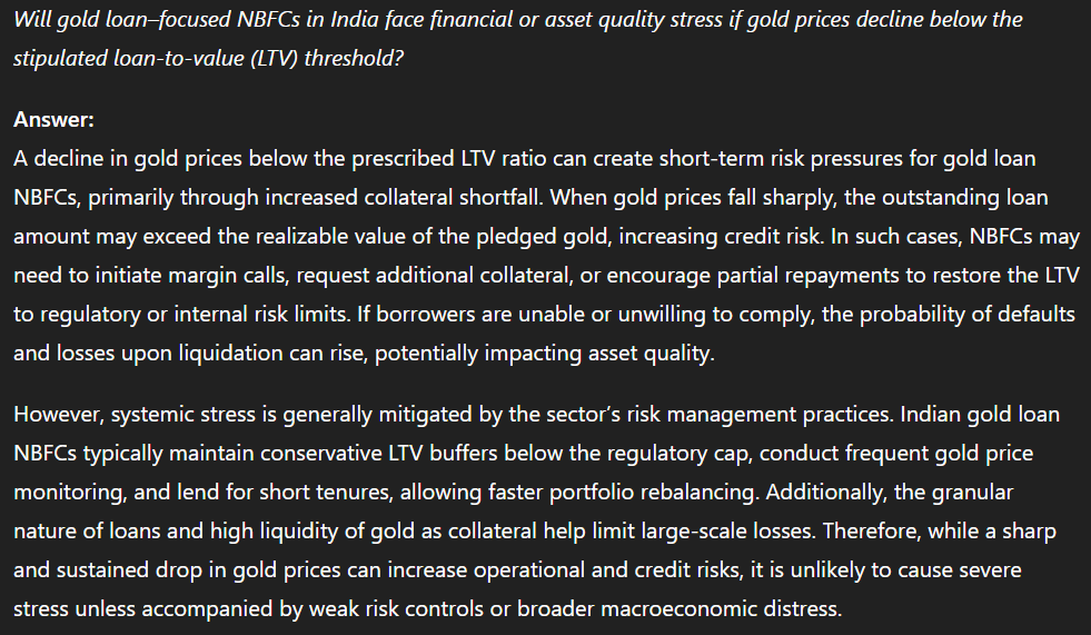 Will gold loan–focused NBFCs in India face financial or asset quality stress if gold prices decline below the stipulated loan-to-value (LTV) threshold?